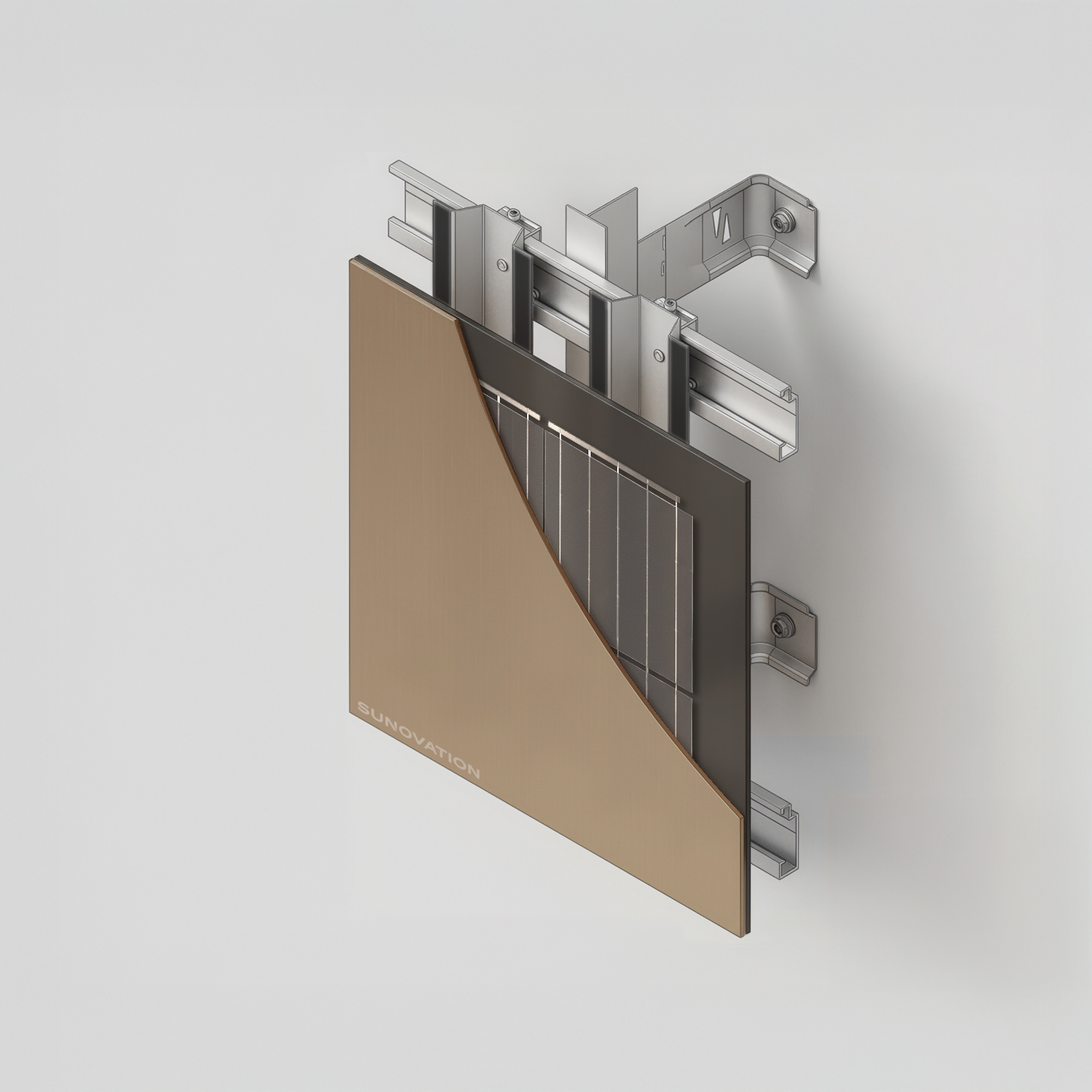 Rahmenlose PV-Fassadenelemente von SUNOVATION bestehen aus einem leistungsstarken, individualisierten, farbigen Glas-Glas-Modul sowie rückseitig aufgebrachten Metallprofilen zur nicht sichtbaren Anbindung an handelsübliche Systeme für vorgehängte hinterlüftete Fassaden. Besonderheit an diesen BIPV-Elementen ist die rahmenlose Ausführung, die eine ästhetisch vollflächige Glasfassade in individueller Rasterung bis hin zu großformatigen, geschosshohen PV-Fassaden ermöglicht.